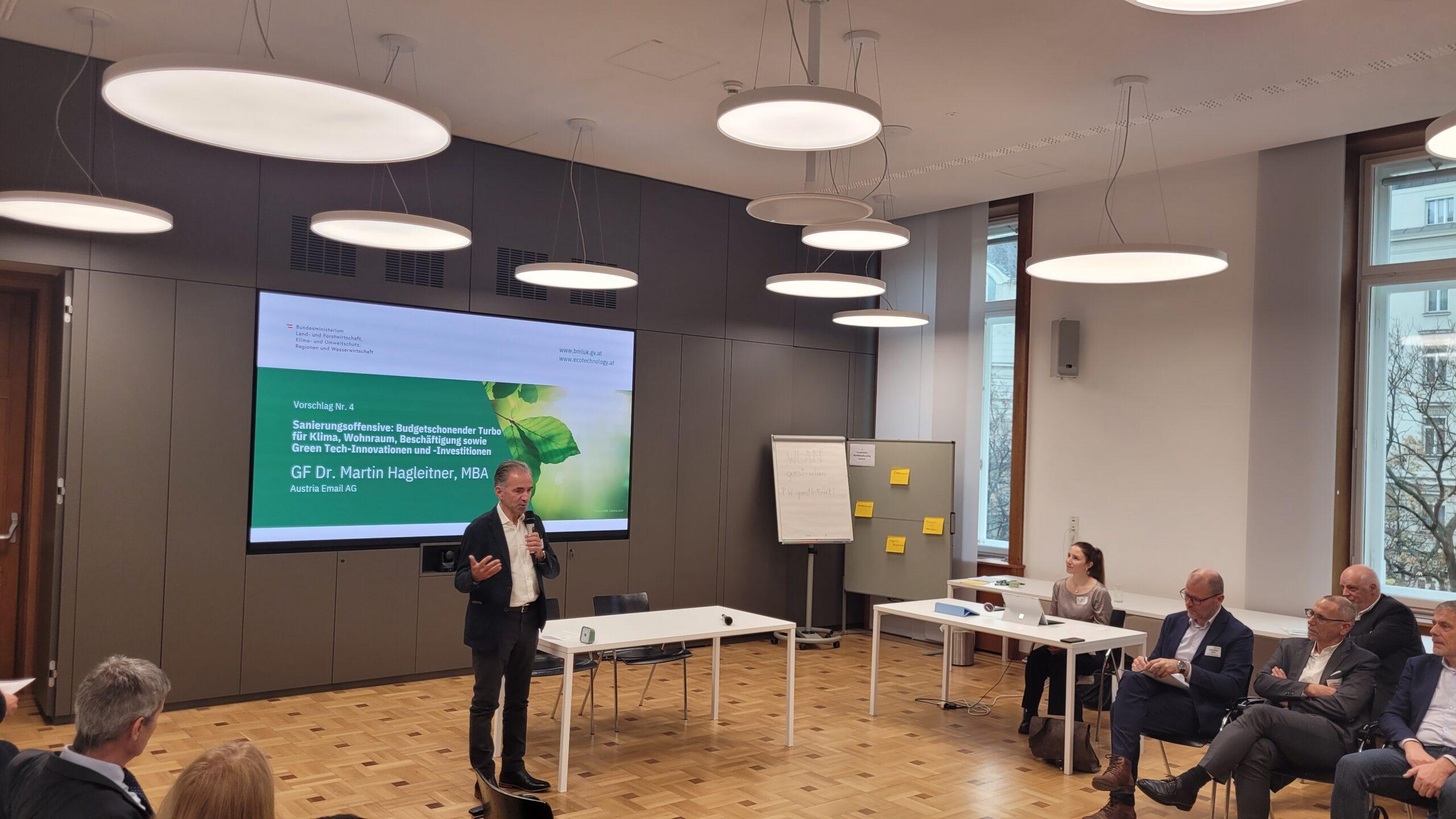 Als vierten Vorschlag diskutierten die Geschäftsführer:innen das Thema ,,Sanierungsoffensive: Budgetschonender Turbo für Klima, Wohnraum, Beschäftigung sowie Green Tech-Innovationen und -Investitionen“. Martin Hagleitner, Geschäftsführer von Austria Email, stellte die Eckpunkte dieses Vorschlags vor. Dabei sollte unter der Federführung von Bundesminister Norbert Totschnig und einer noch zu etablierenden Task Force unter Einbindung der Wirtschaft eine ressortübergreifende bundesweite Sanierungsoffensive gestartet werden. „Diese adressiert mehrere akute Brennpunkte, wie leistbares Wohnen, Energiepreise und die Dekarbonisierung“, so Martin Hagleitner. Durch verbindliche Sektorziele, schrittweisen Ausstiegsplanungen für fossile Heizungen und steuerliche Anreize sollte die Sanierungsrate hinsichtlich Heizung, Warmwasser, Kühlung und thermische Sanierung im Gebäudebestand deutlich erhöht werden.
