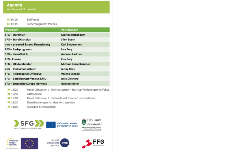• Förderagenturen stellen ihre Programme in 5-minütigen Pitches vor